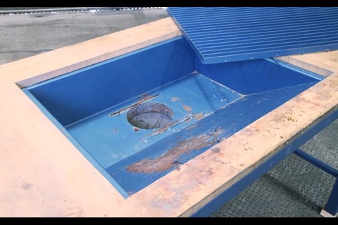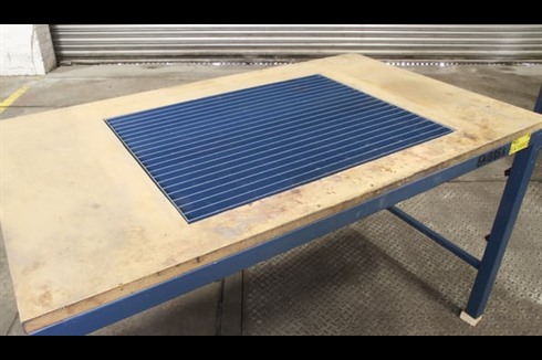 Metal frame fettling table with down draft dust extraction capability. Inset metal grid 840mm x 640mm fitted in a wooden tabletop.