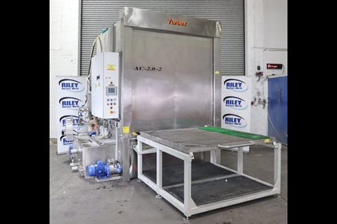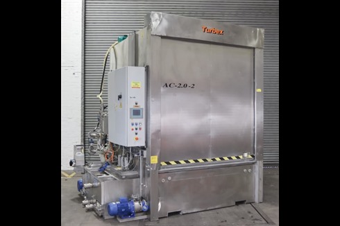 Turbex AC front loading, spray wash machine, designed as a heavy duty stainless steel spray cleaner with thermal and acoustic insulation, powered steam exhaust and powered vertical lifting door with safety features. Two stage, wash and rinse with added steam extraction.