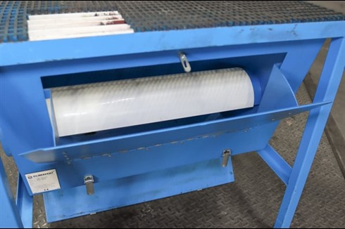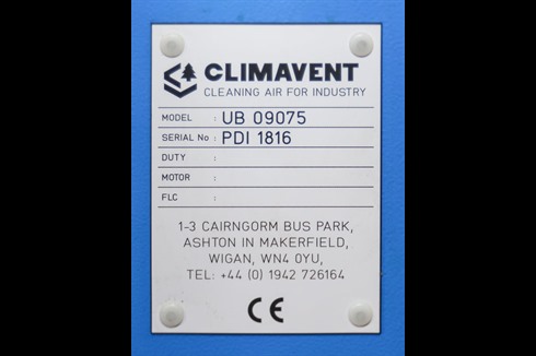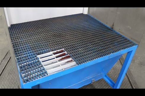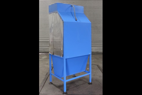 Climavent / Lakestyle Down Draft Fettling Booth with plastic curtains to sides and steel grille. Internal lighting and Ø200mm extraction ducting outlet to the left hand side.