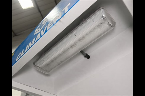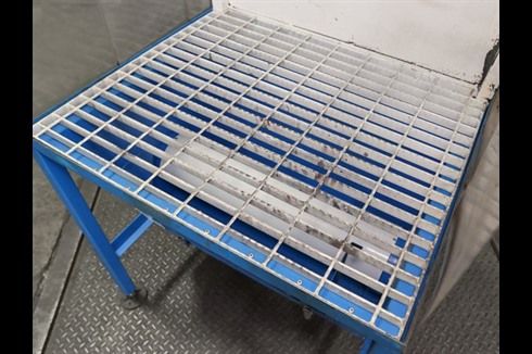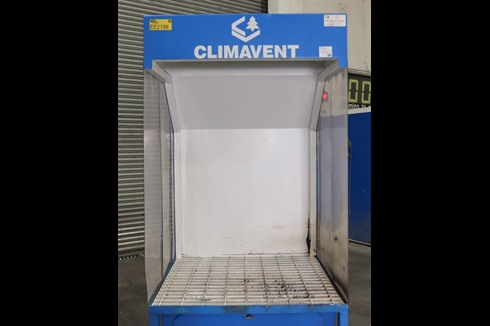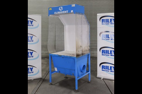 Climavent / Lakestyle down draft fettling booth with plastic curtains to sides and steel grille. Internal lighting and Ø200mm extraction ducting outlet to the right hand side.