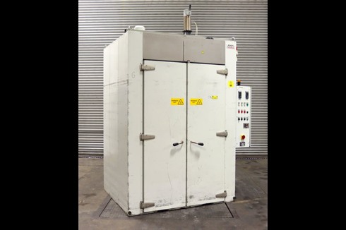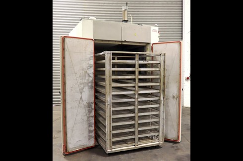 Eliog general purpose 250°C electric oven with double door opening and a wheeled multi-shelf trolley. Two digital temperature controllers for operating and over-temperature control. Air circulation fan and powered exhaust with pressure switches.
