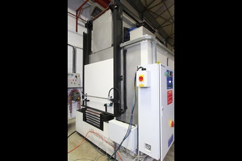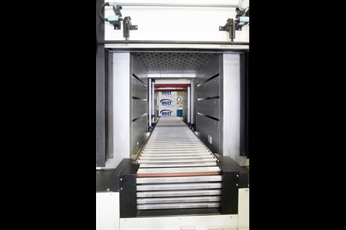 Caltherm oven/cooler with a programable cycle controller, powered opening doors, conveyor through feed and controlled heating and cooling cycles. 32.4kW of heating power ensures rapid heating of the oven chamber.