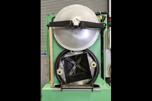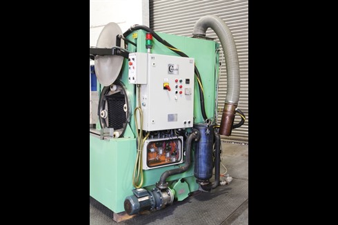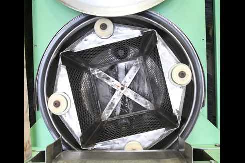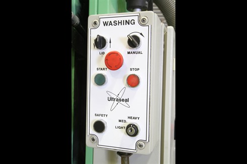 A front loading, aqueous-based industrial parts washing machine. Designed to accept mesh lidded containers filled with components for heated aqueous cleaning. Featuring a rotating drum with flood wash and vacuum drying.