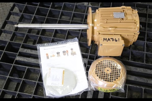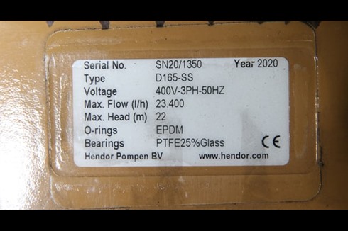 This Hendor SS vertical pump is a single stage centrifugal immersion pump with a capacity of up to 20M³/Hr and a max head of 21M. Included is a spare motor.