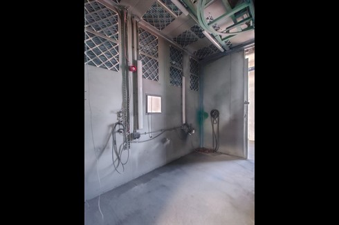 This PB metal finishing manual booth with conveyor & oven features a large wet back spray booth for manual powder/paint application complete with separate gas fired curing oven, both served by a manual overhead oval loop conveyor system.