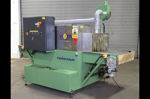 Vixen Tristar Model TS Con (Conveyor) Single Station Spray Wash machine with 800 mm Wide Mesh Belt Conveyor. Originally configured to run with Kerosene Type EXXSOL D80, system includes Extraction, Drip trays and White Spirit Tank with draining system.