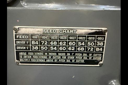 Maximum Pitch diameter – External Spur & Helical Gear 250mm @ 4. ¼’’ Module 10’’ @ 6 D.P. Maximum Pitch diameter Internal Spur & Helical 152mm @ 4.1/4’’ Module 6’’ @ 6 D.P. Maximum face width 51mm (2’’). Maximum helix angle 45°. No. & range of cutting speeds (6) 156/515 strokes per minute. Cutter feeds per stroke (8) 0.06/0.013 per cm of cutter diameter 0.006’’/0.0013’’ per inch of cutter diameter. Motor power 1.1 kW (960rpm) 1.5hp (960rpm). Maximum stroke of cutter spindle 50mm. Cutter spindle dia.70mm. Dia. of work table 140mm. Dia. of hole in table 53mm.Complete with change gears. One & two cut cams. Change Gears.