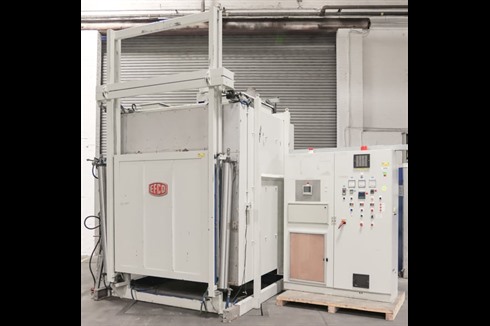 An Efco 850°C electric heavy duty box furnace with powered vertical opening door. Originally commissioned for the aerospace industry for the heat treatment of steel and aluminium components.