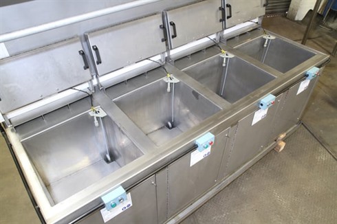 Multi-stage aqueous 4 tank, all stainless steel immersion process cleaning/coating line with integrated twin level extraction ducting control panel.