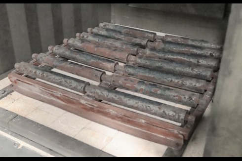 This steel lined, 670°C, roller hearth, industrial, air circulated oven has a large chamber size of 950mm x 1000mm x 950mm. Featuring a vertical lifting door, Eurotherm 3208 PID controller and Eurotherm 3216 over temperature controller.