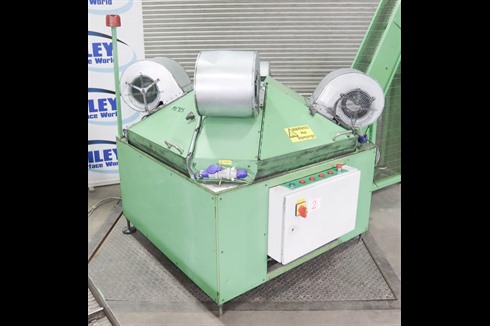 This cooling unit was originally designed to cool hot none ferrous stamping prior to the next operation. Parts were moved on a metal belt conveyor into the slowly rotating table which moved them below the four cooling fans, one at a time to reduce the temperature of the parts prior to being conveyed to the next operation.